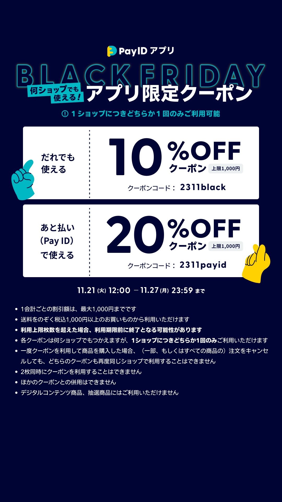 2023年11月21日(火)〜11月27日(月)に、「Pay IDアプリ限定ブラックフライデークーポンキャンペーン」を実施します。