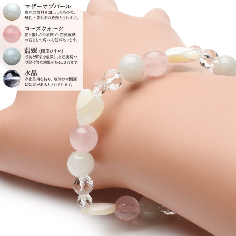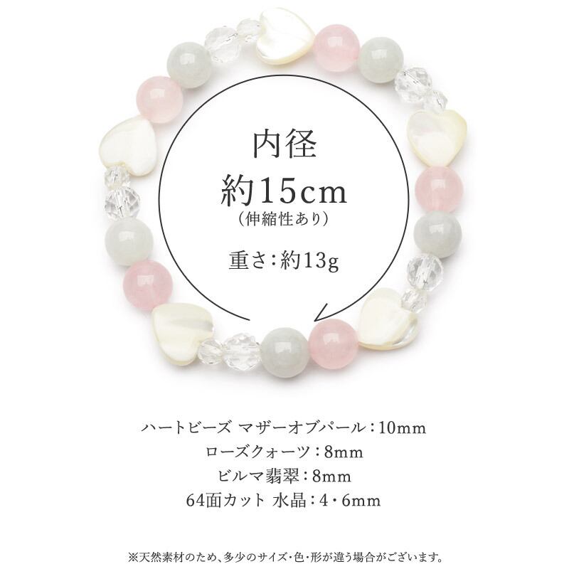 ・材質:マザーオブパール ハート 10mm、ビルマ翡翠(硬玉ジェダイト) 8mm、マダガスカル産ローズクォーツ 8mm、64面水晶 6mm、64面カット水晶 4mm