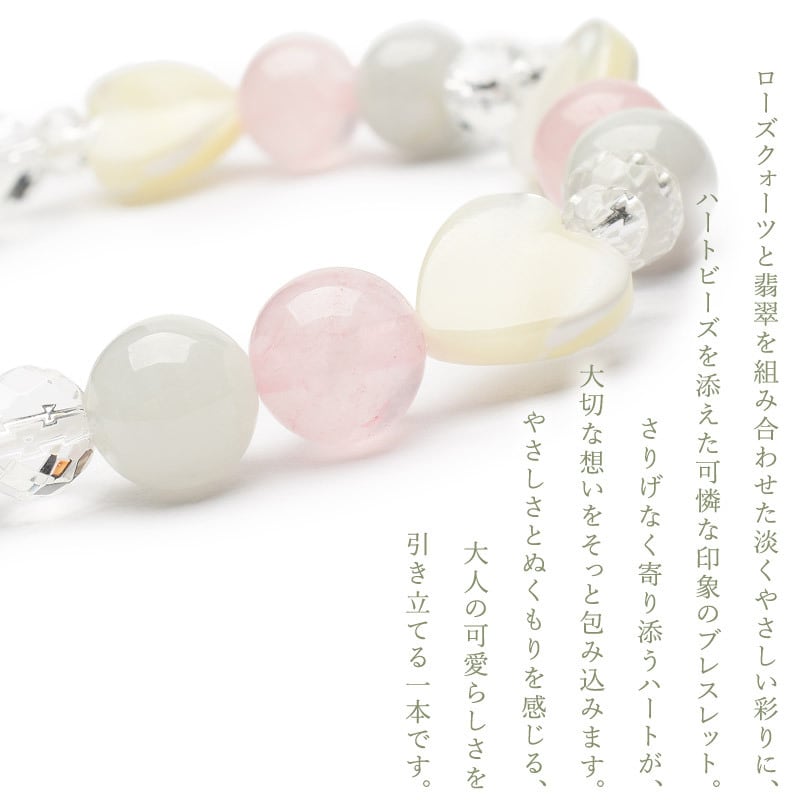 マダガスカル産のローズクォーツとミャンマー産のビルマ翡翠を組み合わせた淡い彩りに、母貝特有の輝きが美しいハート型のマザーオブパールが可愛らしい印象のブレスレットに仕上げました。優しさとぬくもりを感じる大人の可愛らしさを引き立てる一本です。