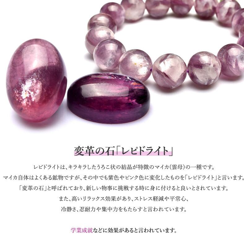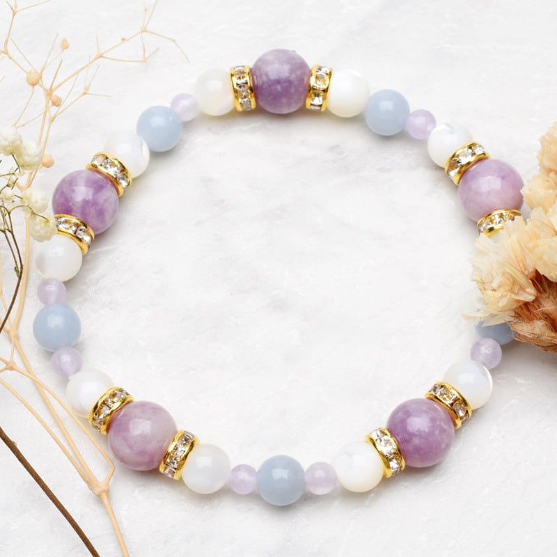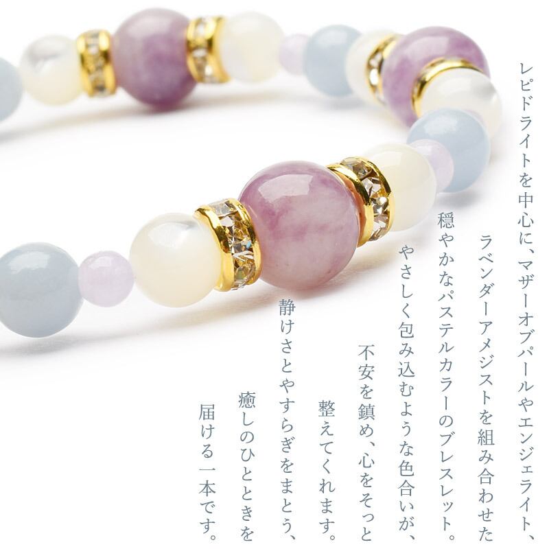 雲母のキラキラとした輝きが美しいレピドライトを中心に、マザーオブパールやエンジェライト、ラベンベンダーアメジストを組み合わせた穏やかなパステル調の紫が美しいブレスレットに仕上げました。やさしく包み込むような色合いが不安を鎮め、安らぎと癒やしのひとときをお届けする一本です。