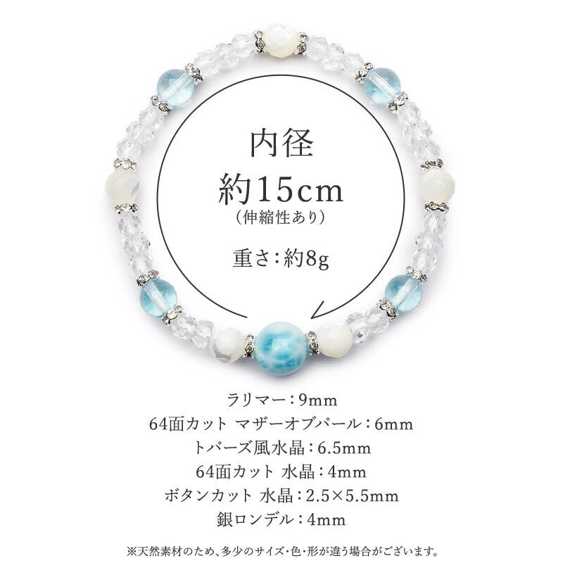 ・材質:ラリマー 9mm、マザーオブパール(64面カット) 6mm、64面カット水晶 4mm、水晶ボタンカット 2.5x5.5mm、トパーズ風水晶 6.5mm、銀ロンデル(クリアー) 4mm