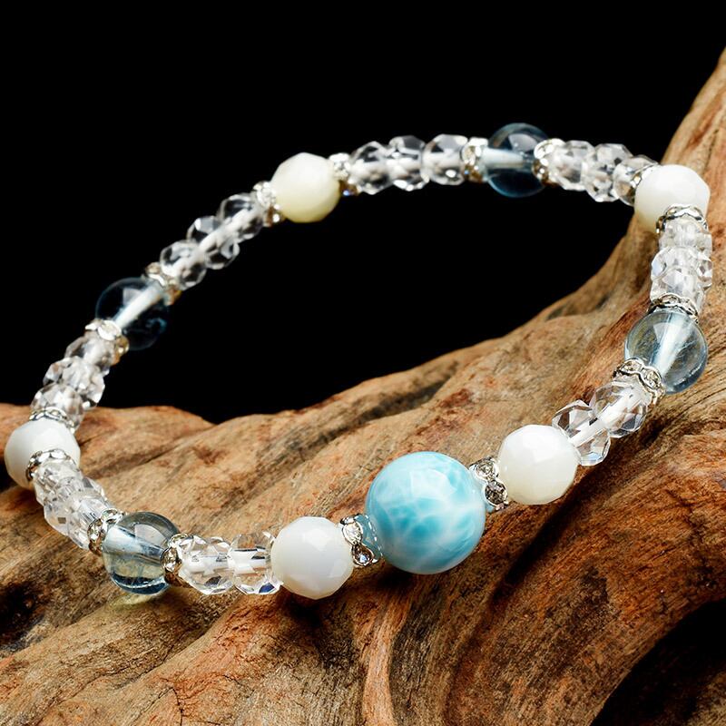 ラリマーを主役に、小粒のマザーオブパールや水晶をあしらい、可憐で清楚な印象に仕上げたブレスレットです。爽やかで柔らかな色合いが手元に優しさを添え、見るたびに癒やしを感じさせてくれます。愛と安らぎをそっともたらす、穏やかな魅力を持つ一本です。