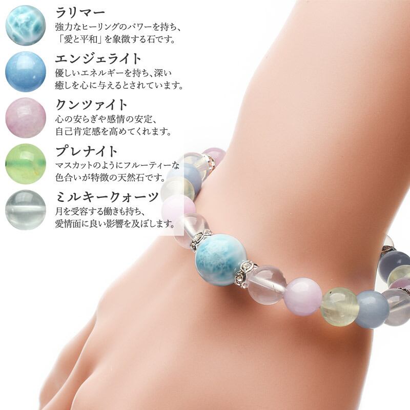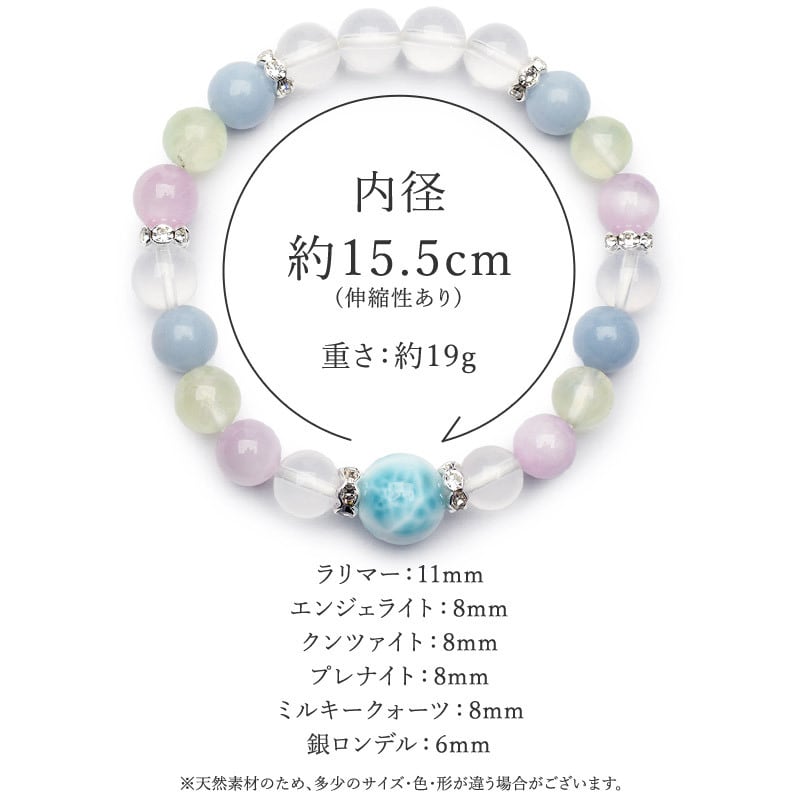 ・材質:ラリマー 11mm、ミルキークォーツ 8mm、クンツァイト 8mm、プレナイト 8mm、エンジェライト 8mm、銀ロンデル(クリアー) 6mm