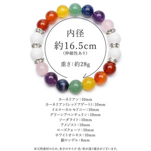 ・材質:カーネリアン 10mm、赤瑪瑙 10mm、イエローカルセドニー 10mm、グリーンアベンチュリン 10mm、ソーダライト 10mm、アメジスト 10mm、ローズクォーツ 10mm、ホワイトオニキス 10mm、銀ロンデル(クリアー) 8mm