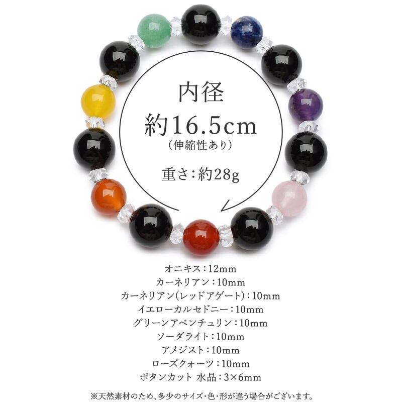 高発色の7色の天然石と厄除けに人気のオニキスを等間隔に配置し、ロンデル不使用で金属アレルギーがご心配の方でも安心して身につけていただけるブレスレットに仕上げました。