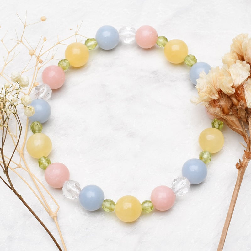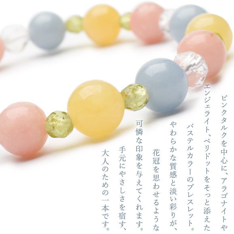 マットな質感でパステルカラーが可愛らしいピンクタルクやエンジェライト、アラゴナイトを使用し、ペリドットを添えることで花冠のような可憐な印象のブレスレットに仕上げました。
