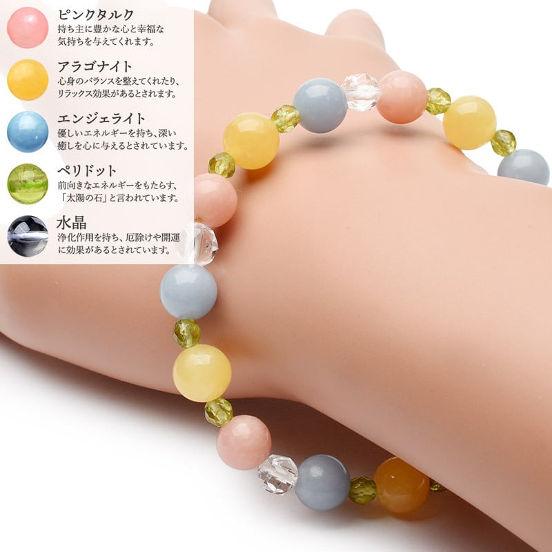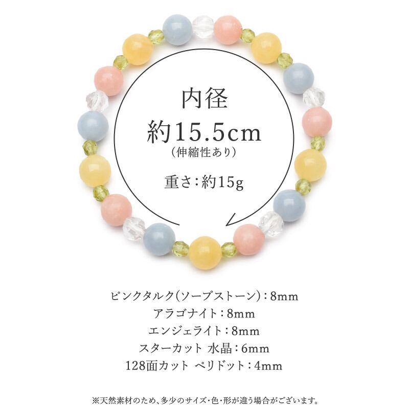 ・材質:ピンクタルク(ソープストーン) 8mm、アラゴナイト 8mm、エンジェライト 8mm、水晶スターカット AA 6mm、ペリドット 128面カット 4mm