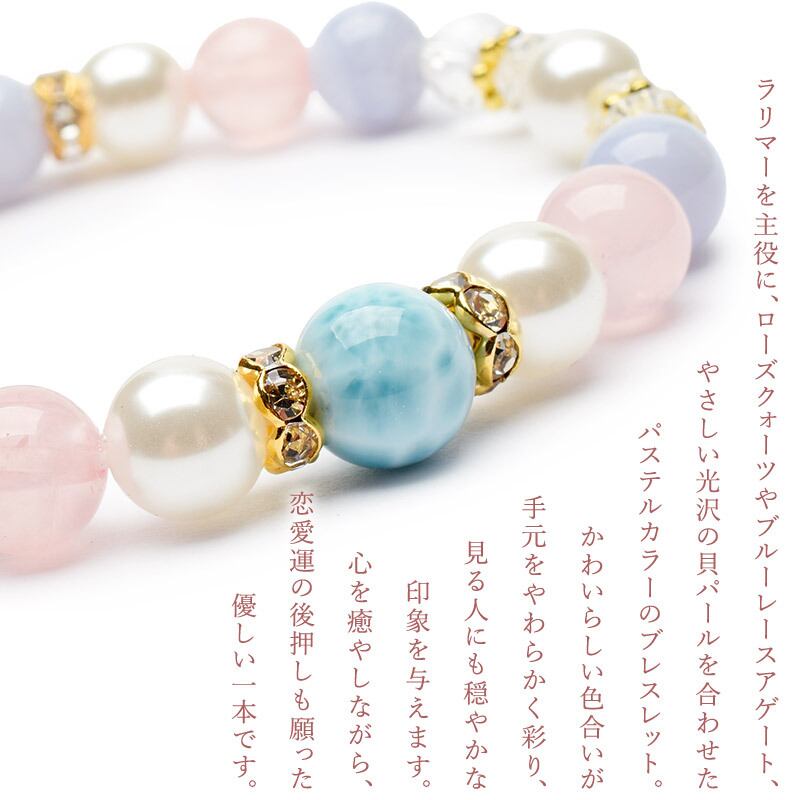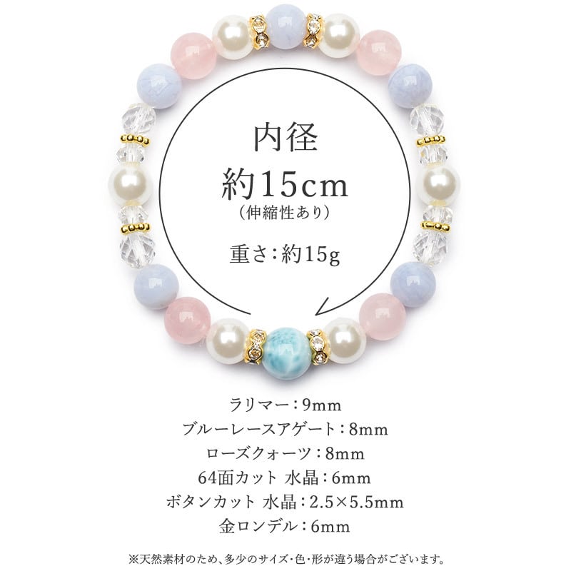 ・材質:ラリマー 9mm、貝パール 8mm、マダガスカル産ローズクォーツ 8mm、ブルーレースアゲート 8mm、64面水晶 6mm、水晶ボタンカット 2.5x5.5mm、ロンデル(クリアー) 6mm