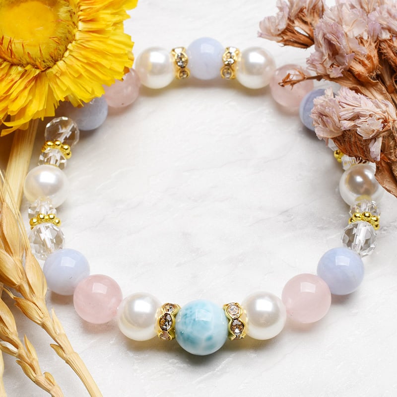 波模様がくっきりと浮かぶ、ドミニカ共和国産の高品質ラリマーを使用したオリジナルデザインのブレスレットです。ラリマーを主役に、人気のマダガスカル産ローズクォーツやブルーレースアゲートをあしらい、穏やかで可愛らしい配色のデザインに仕上げました。