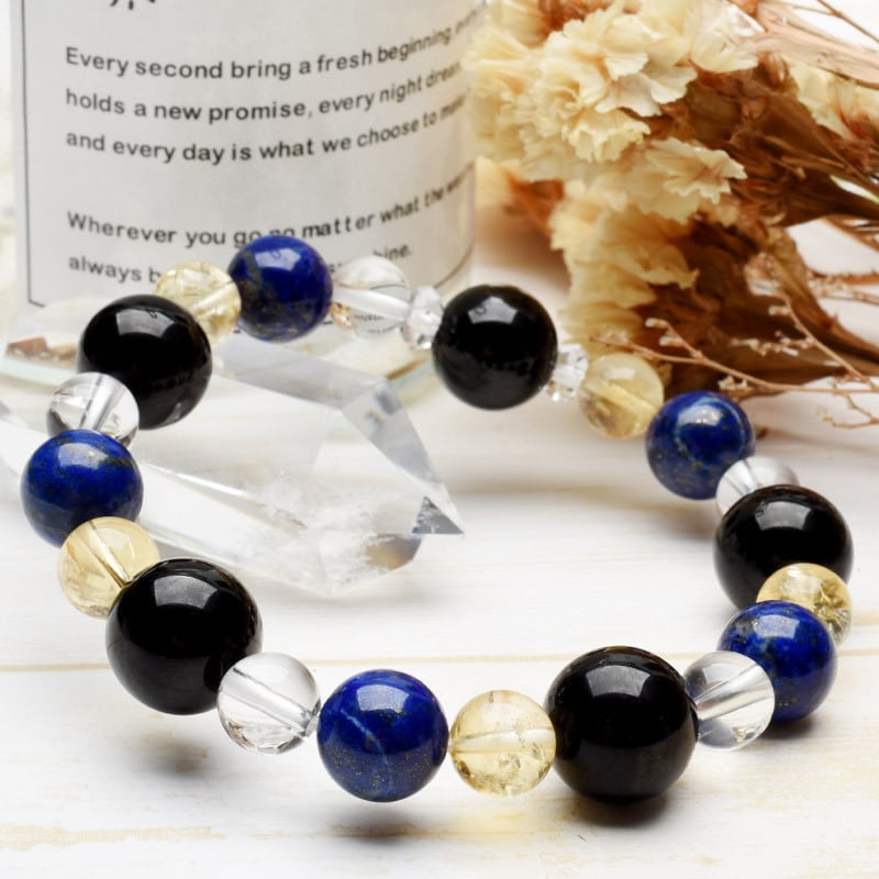 【厄除け・幸運・金運】天然石 モリオン・ラピスラズリ・シトリン 御守ブレスレット(12mm)
