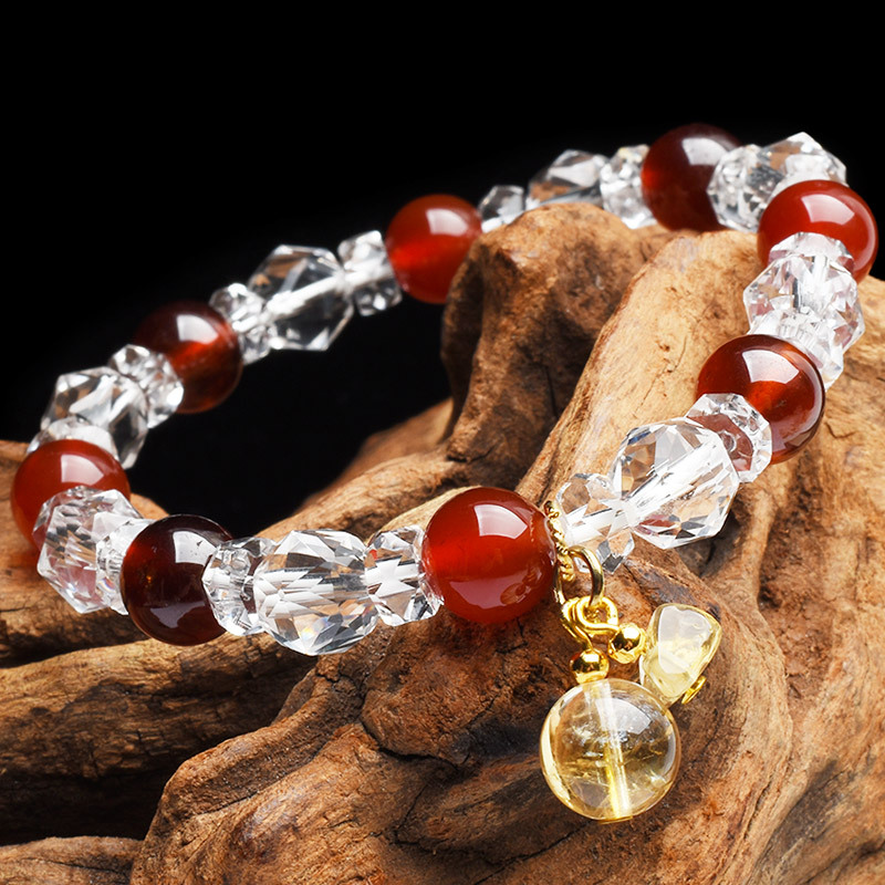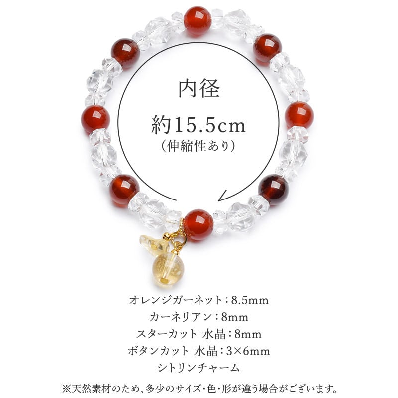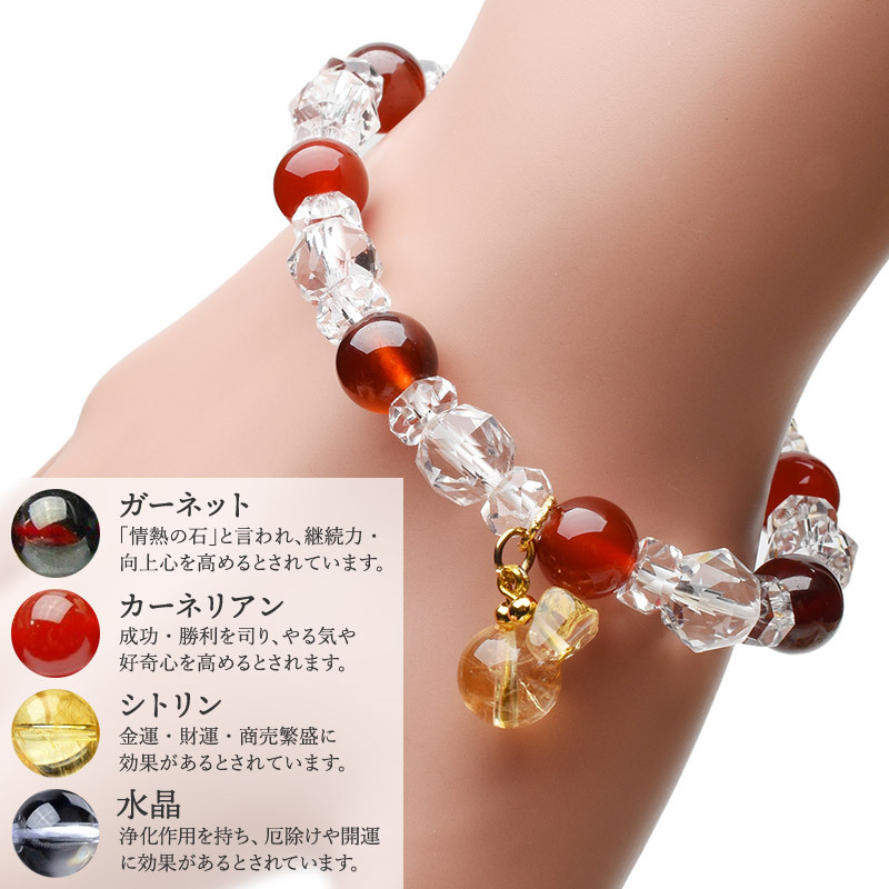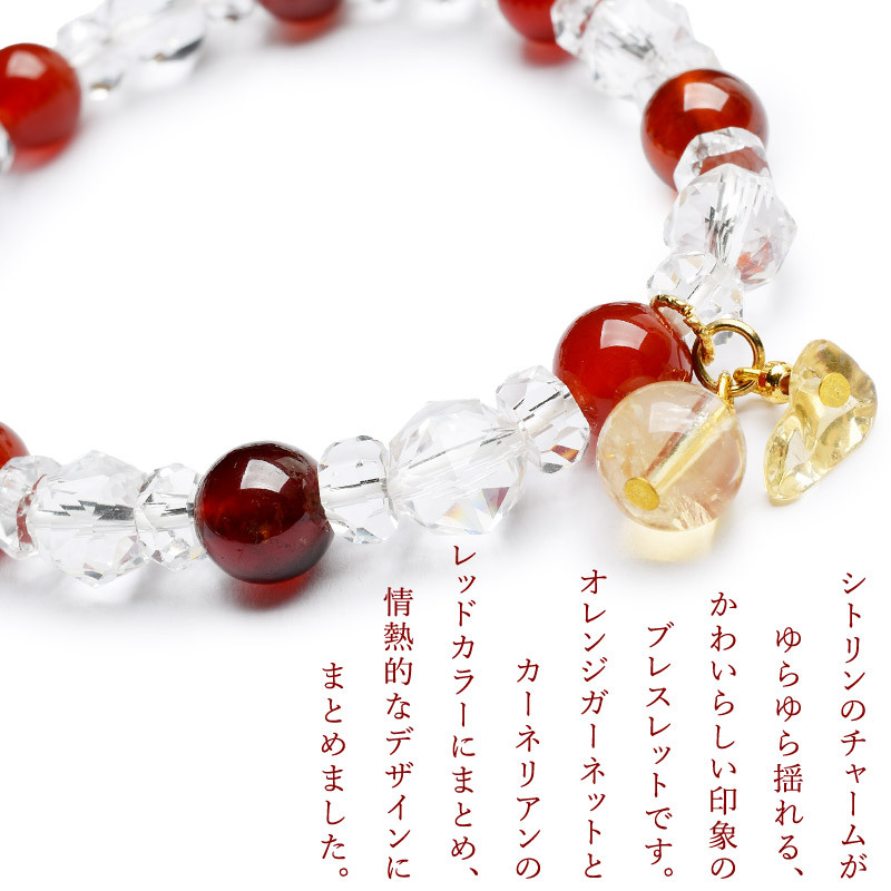 ガーネットとカーネリアンで活力溢れるあなたの向かう先を明るく照らして目標達成に向け後押しをしてくれます。またカット水晶が全体的な運気も向上させてくれ、お守りとしてもおすすめです。チャームに揺れるシトリンが、さり気なく金運アップもお手伝いします。