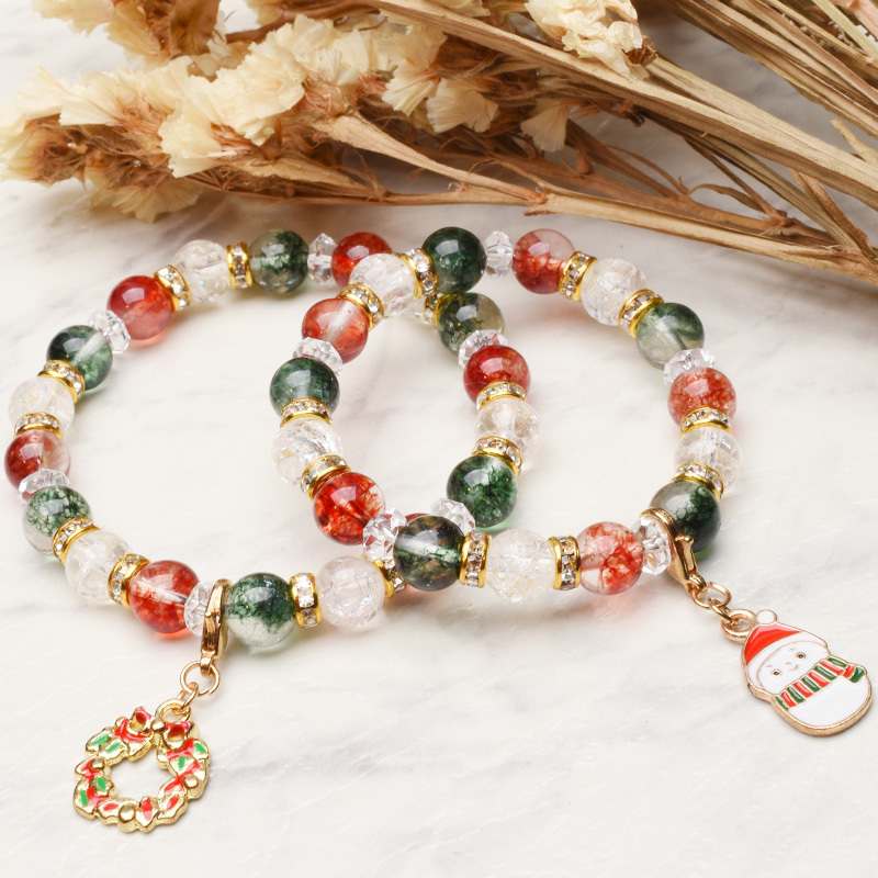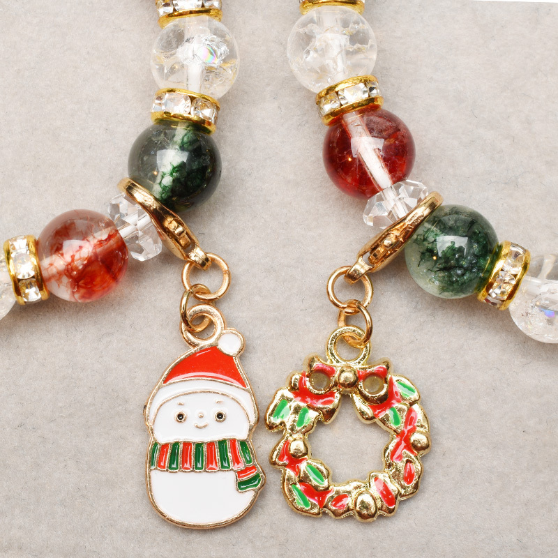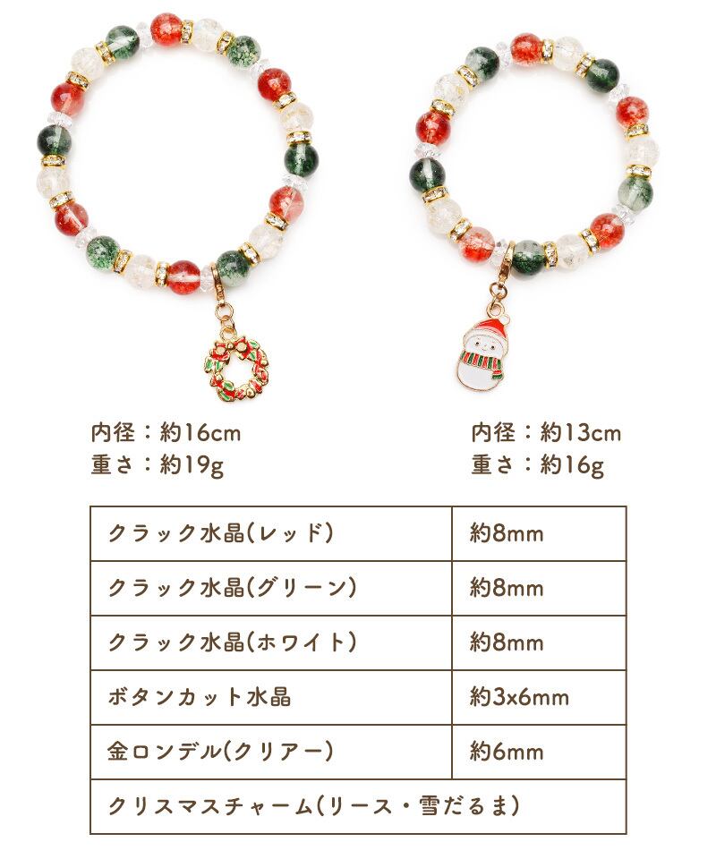 レッド・グリーン・ホワイトの三色のクラック水晶を使用し、雪だるまやリースのチャームが可愛らしい、親子で楽しめるブレスレットをデザイン致しました。