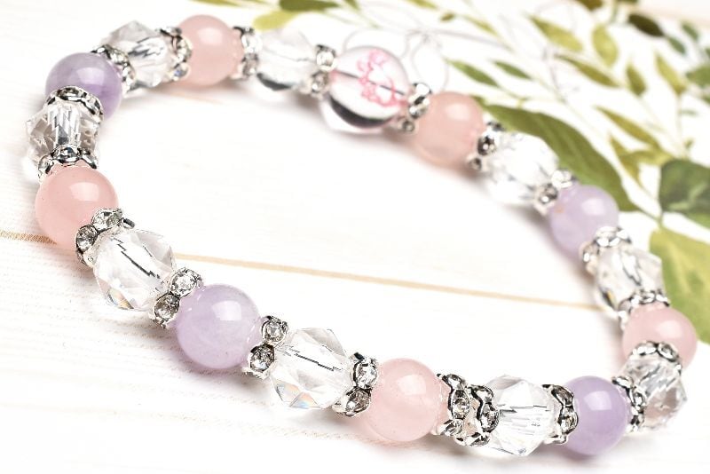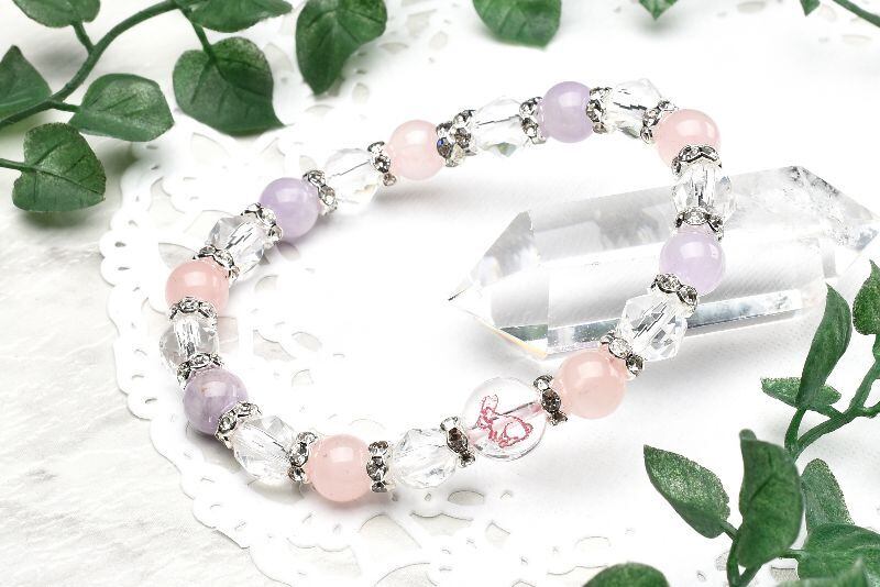 どちらもミルキーで可愛らしい印象のマダガスカル産ローズクォーツとラベンダーアメジストを組み合わせ、女性らしい印象のブレスに仕上げました。スターカット水晶とロンデルがキラキラと輝き、お手元を美しく着飾ってくれるでしょう。