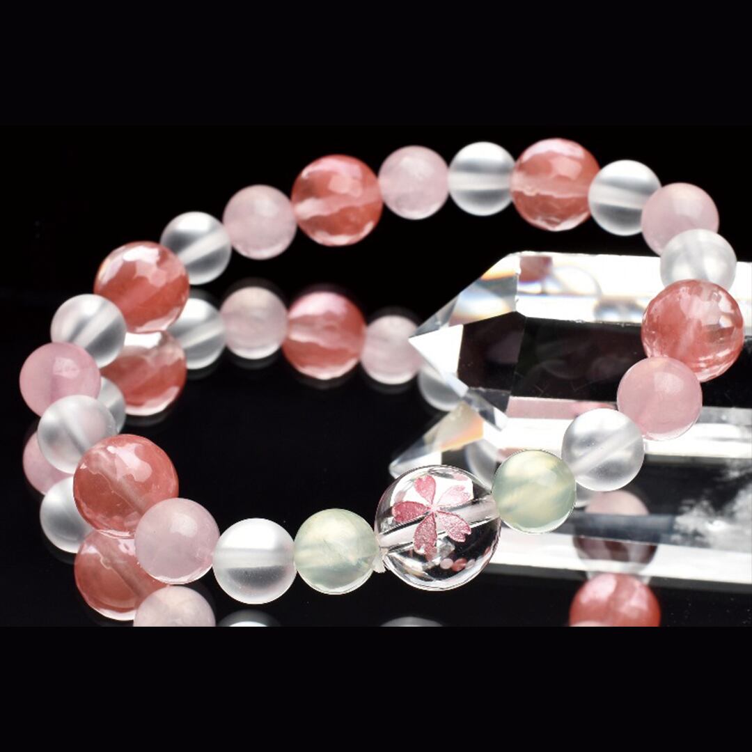 ・材質:水晶 ピンク彫り 桜:10mm、プレナイト:8mm、水晶 フロスト:8mm、ローズクォーツ:8mm、チェリークォーツ 128面カット:10mm